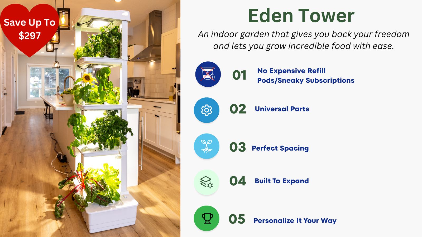 I purchased 2 Eden Towers through their kickstart program. I was so excited when they arrived. We had a few hiccups with shipping and a couple items were damaged but they quickly shipped out replacement parts and I was off to growing!! I just cleaned my tower and started about my 5th batch of plants. I have used it to start all my plants that I put outdoors in my garden and they are doing wonderful!!! During the winter I kept greens for salad - tastes SO much better than store bought! I have a tower from another company but this one surpasses it in quality, ease of growing, ease of cleaning (VERY easy to clean!!!!) and putting it together has been a breeze. PLUS it looks much better than the other round bulky one I have. This is sleek, fits nicely in a corner or along a wall...give it a try!! I think you will LOVE it!!