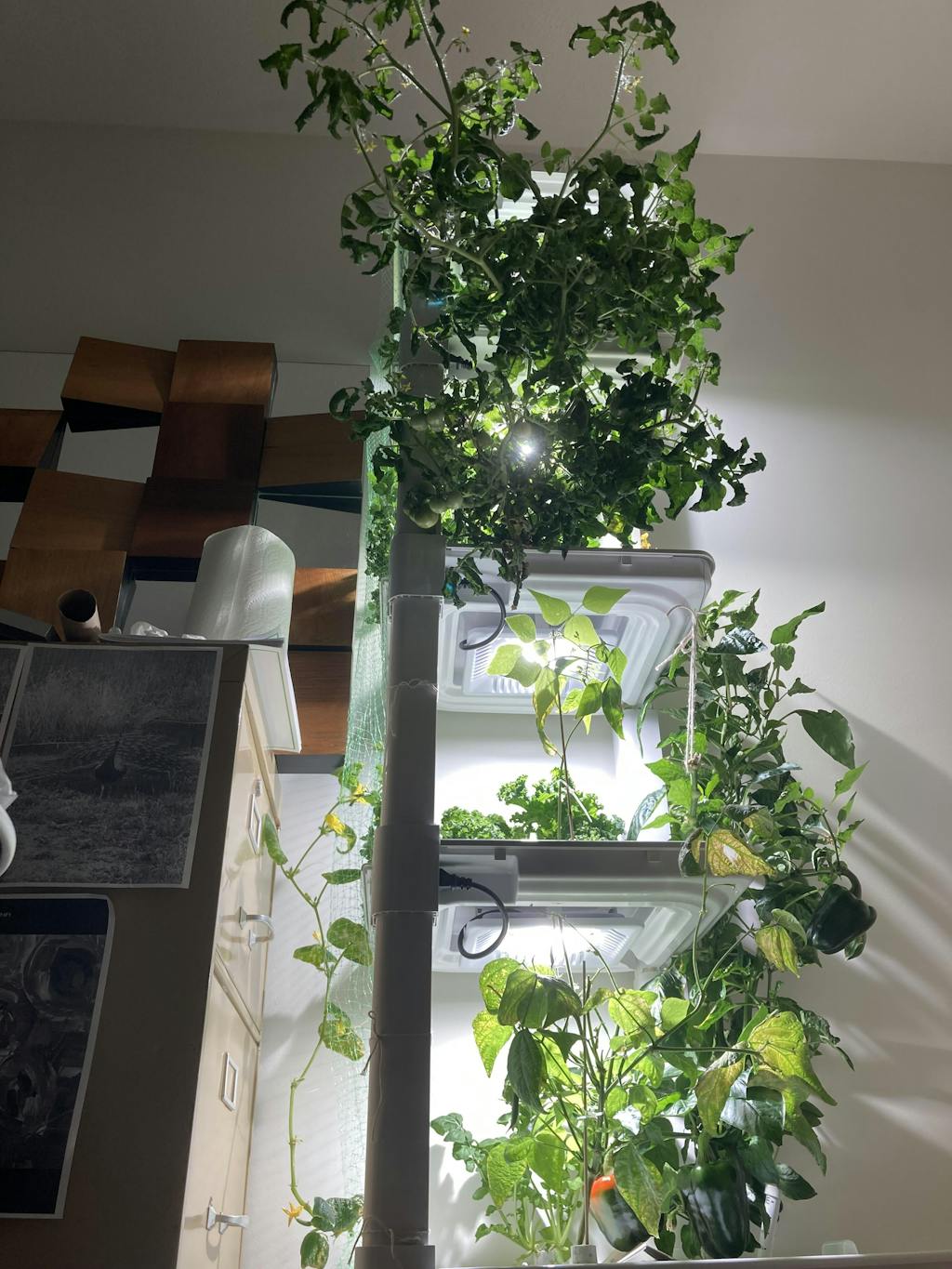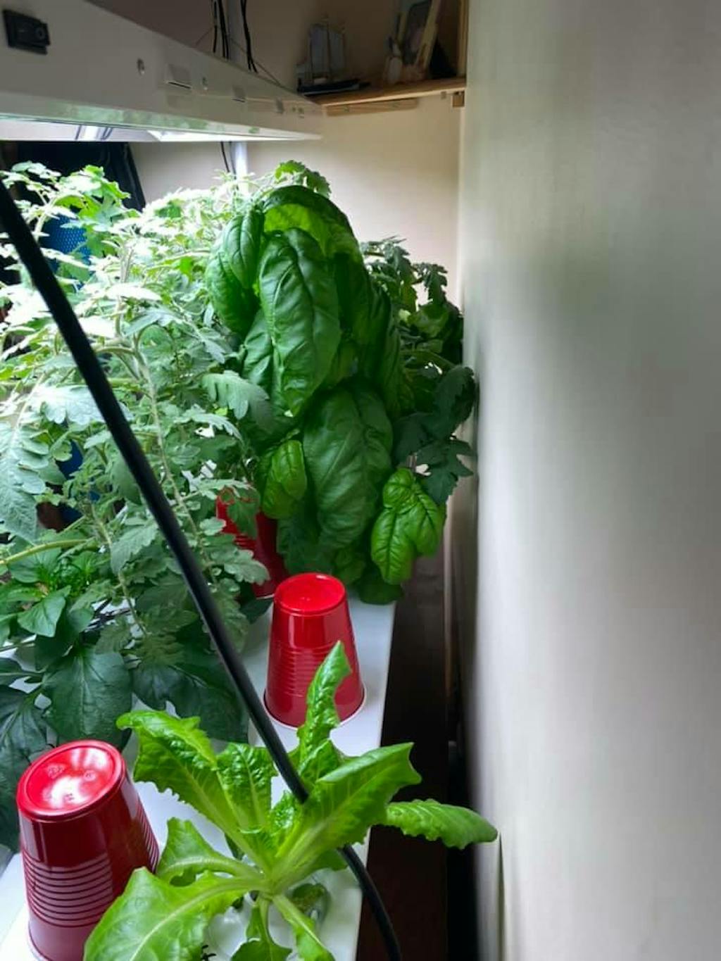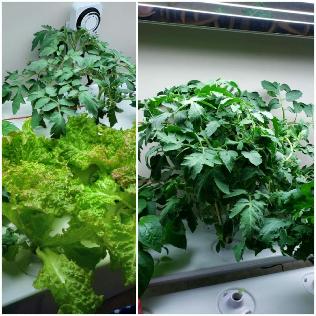 Two weeks difference between the tomatoes on the left and the tomatoes on the right. We polished all the lettuce, have tons of kale, spinach is growing nicely, and currently I have 2 strawberries that sprouted, a bean and 2 peppers that are coming along nicely. I love this set up!!!??