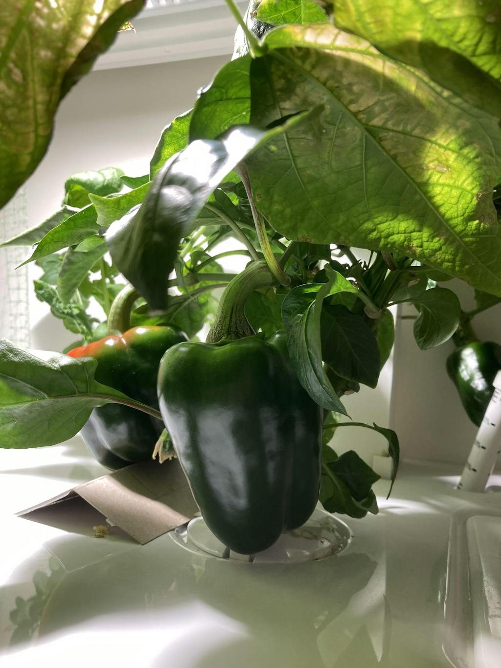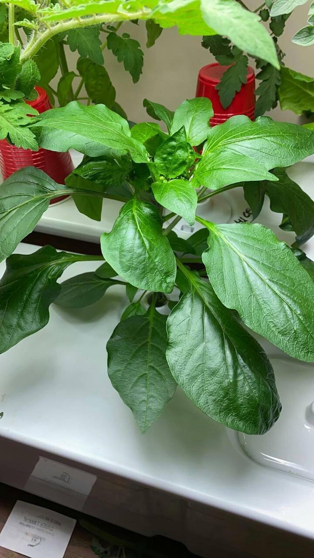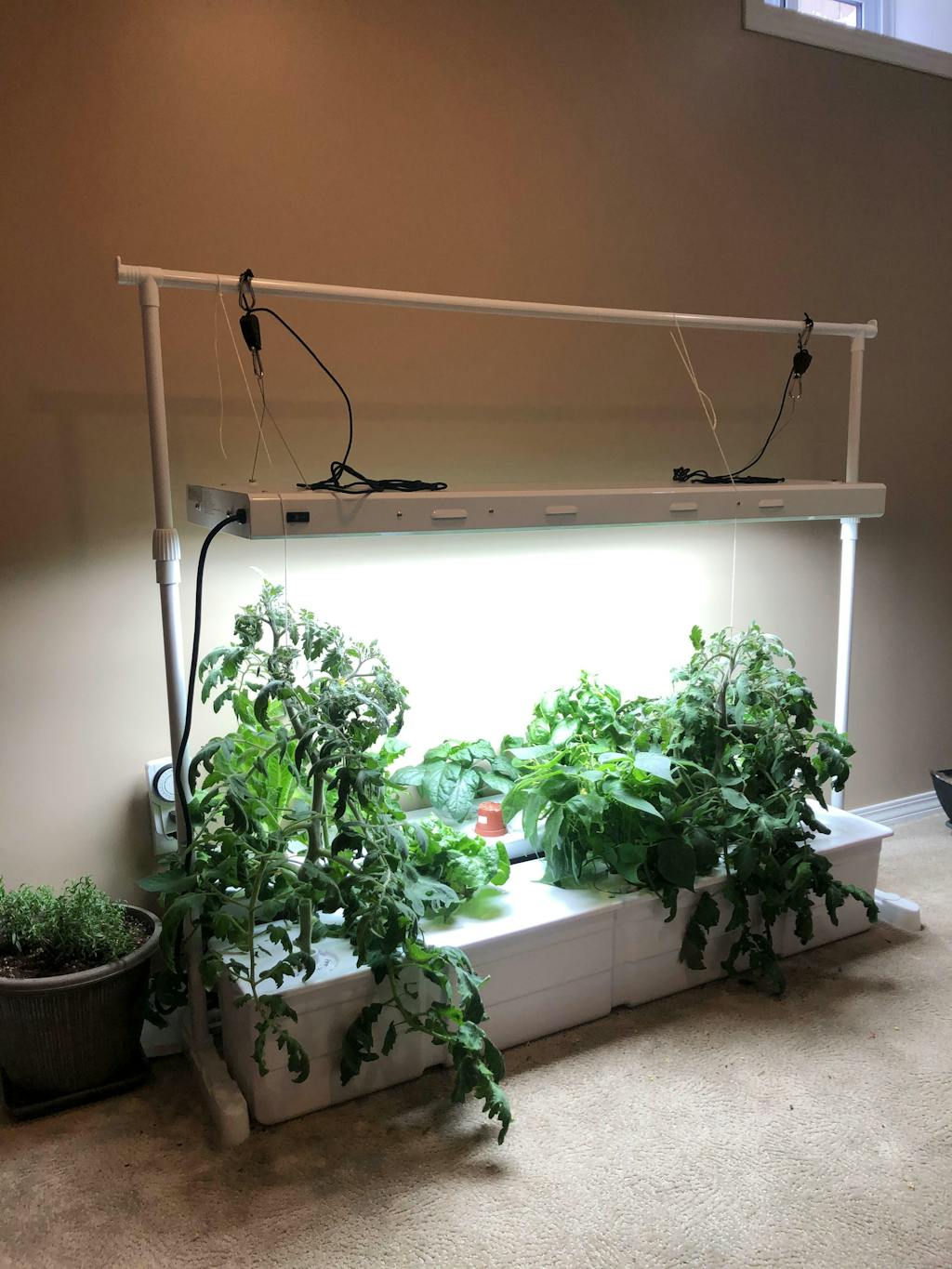 Two weeks difference between the tomatoes on the left and the tomatoes on the right. We polished all the lettuce, have tons of kale, spinach is growing nicely, and currently I have 2 strawberries that sprouted, a bean and 2 peppers that are coming along nicely. I love this set up!!!??