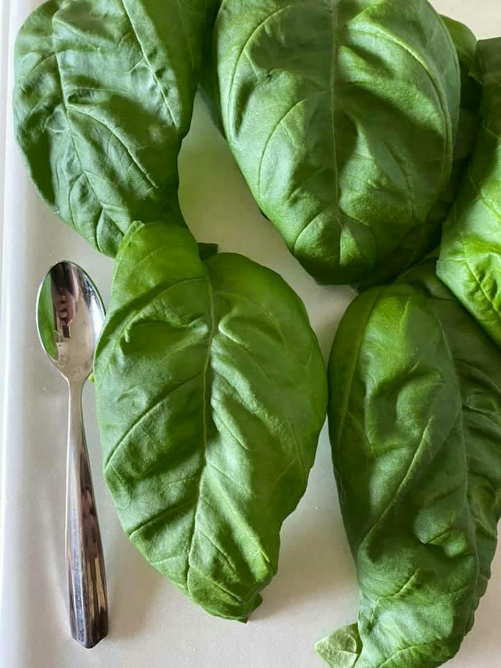 The teaspoon hopefully gives you a sense of their size. This garden was started March 6, 2021 tomatoe plants, lettuce plant you can๏ฟฝt really see behind the basil but it๏ฟฝs producing. Also last photo is the bell pepper plant also started March 6, 2021. The lettuce plant in front of the basil was started March 24, 2021.