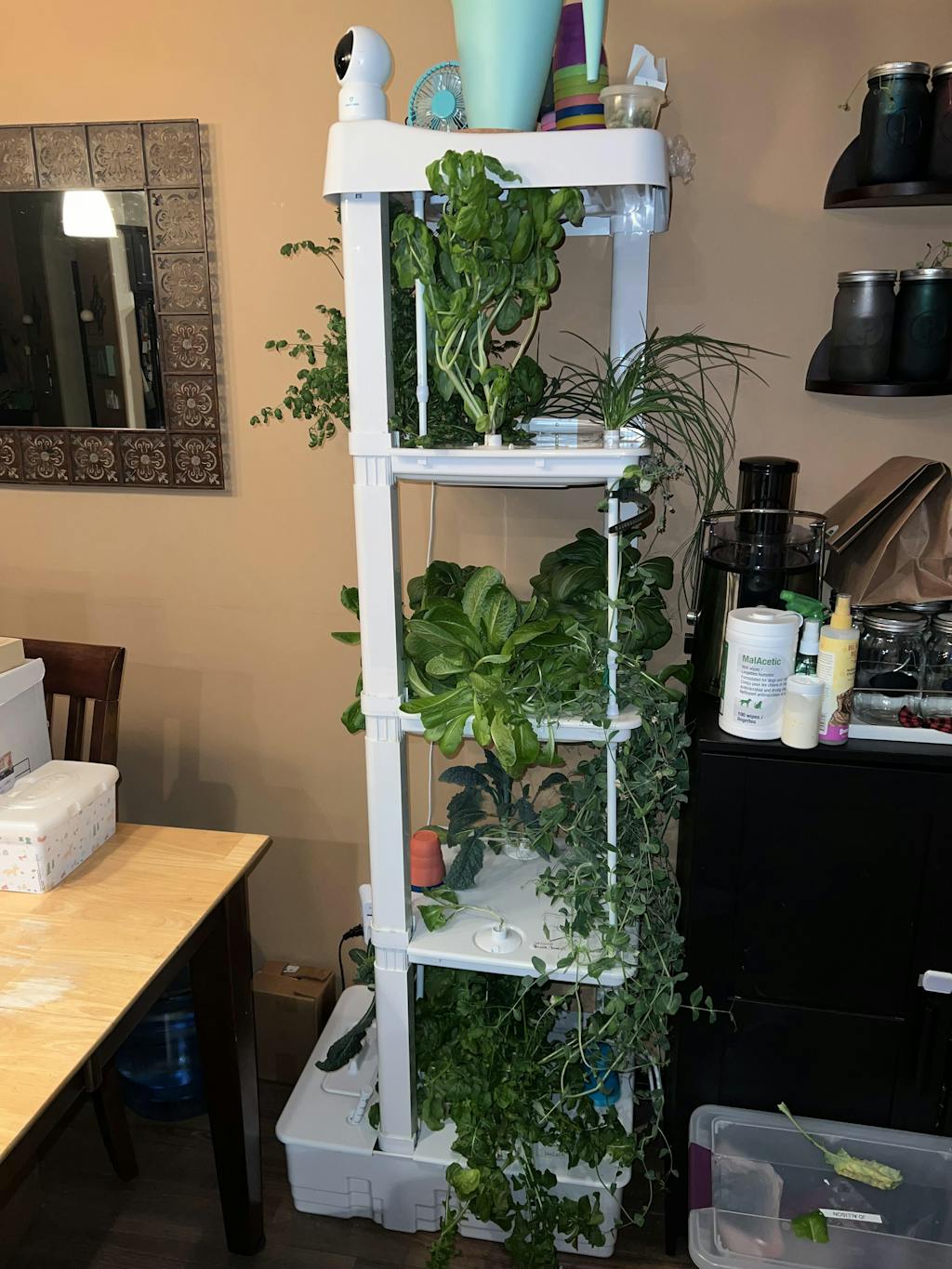 Pros: The system is incredibly user-friendly, even for beginners like myself. The vertical design makes it perfect for small spaces, like apartments or in my case my dining room. I have it nestled nicely in a corner. I'm consistently amazed at how much produce I can grow in such a small footprint. Growing my own food has never tasted better! The herbs and greens are incredibly fresh and flavorful. It's been a fascinating learning experience, and I've enjoyed learning about hydroponics and plant growth. Email updates and updates on social media platforms are helpful and keep me up to date to changes, parts, and new tips