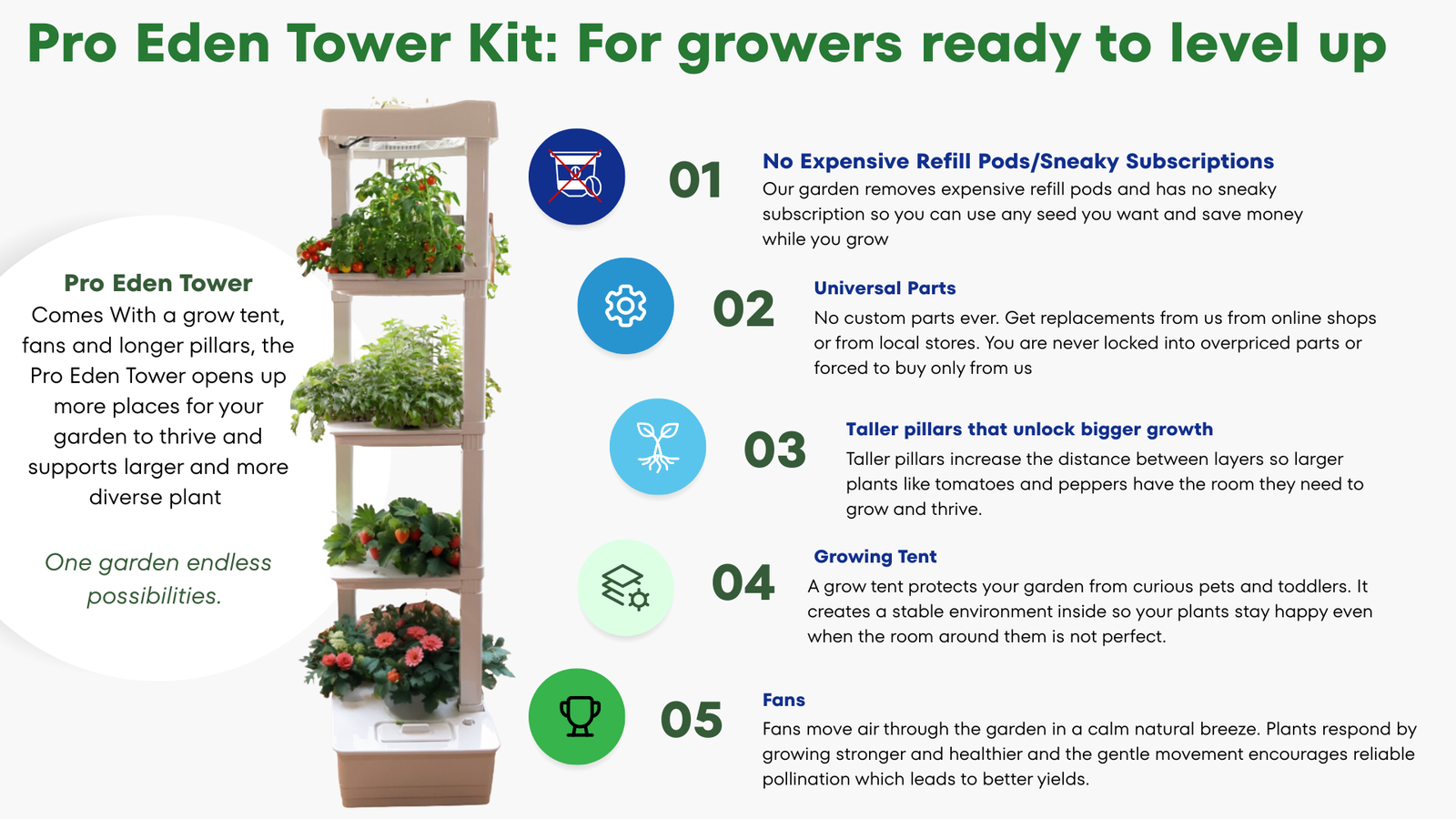 The Pro Eden Tower builds on the basics with a more robust growing setup. You get everything in the Basic, plus grow tent, clip-on fans, and extension pillars. Ideal for larger harvests and more control over your growing environment.